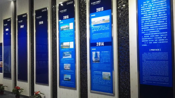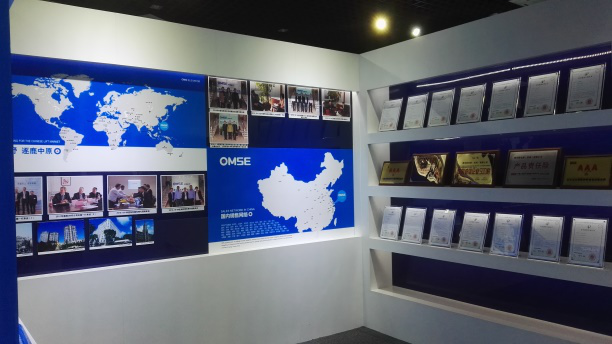 2016 年4月 18日,投资数拾万元,聘请当地最资深电梯展厅设计大师精心设计,历时数月用心装修的奥玛斯公司展示厅隆重开门迎客。走进奥玛斯展示厅,呈现给你的是蓝白相间的视觉艺术,大面积蓝色的主打基调,蕴含着奥玛斯人如大海般广阔的胸襟;白色的辅助色,是一个恰当好处的衬托,视觉上倍显洁净利落。整个展厅,设计师想通过图文、照片、实物来层层铺展与表述出世界电梯与中国电梯 “互联”的发展历史,奥玛斯的人文情怀,走过的辉煌岁月,经典项目的记忆,最新科技产品成果。基于这些表达的需求,整个展厅通过不规则“S型”展板的设计被划分成几个功能性区域,沿着参观通道,让参观者驻足在每个区域面前都能去触摸与感悟到奥玛斯人想要表达主题所在。