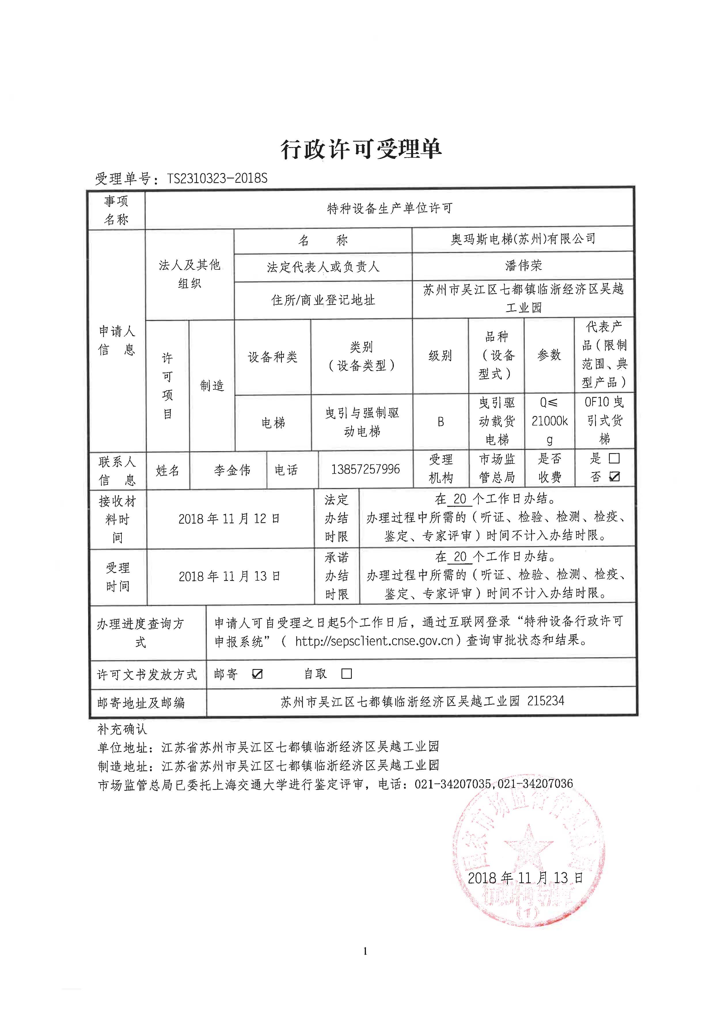 在载货类电梯一系列的大研发投入、及性价比高的好产品的相继推向市场。奥玛斯的“回头客户”也越来越多,产品美誉度也越来越高。但奥玛斯人永不自满,不会因此固步自封。在激烈的市场竞争面前,奥玛斯人时刻保持着一份清醒与危机意识。所以只要有机会,奥玛斯人就不会轻意放弃。2018年奥玛斯公司根据中国电梯市场大吨位货梯的需求动向,果断接受常州某客户的要约,试制一台超大吨位的21T 速度0.33M/S的 6:1结构的载货电梯产品。目前该产品的试制许可申请已顺利通过国家市场监督管理总局的批准。(附“行政许可受理单”)